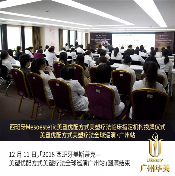 12月11日,「2018西班牙美斯蒂克—美塑优配方式美塑疗法巡演广州站」圆满结束!卢凯制药副总裁刘敬梅、配方式美塑疗法大师Dr.Ayala等到场进行交流指导。双方强势合作,为广大求美者带来高质量的紧塑美肤新体验。同时,广州华美医疗美容医院正式授证为“美斯蒂克配方式美塑疗法临床指定机构”!