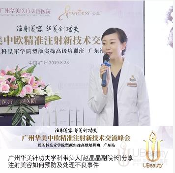 8月28日,由圣科皇家学院主办、广州华美医疗美容医院承办的“2019公主玻尿酸中欧精准注射新技术交流峰会暨圣科皇家学院塑颜实操高级培训班广东站”在广州华美13楼大型会议室隆重举办。广州华美针功夫学科赵晶晶副院长作为国内医美行业注射美容导师之一,以Princess™-Z特色面部注射技法研发医师、公主玻尿酸不良事件预防处理联盟核心顾问医师的身份出席,并进行安全塑美的技术分享。