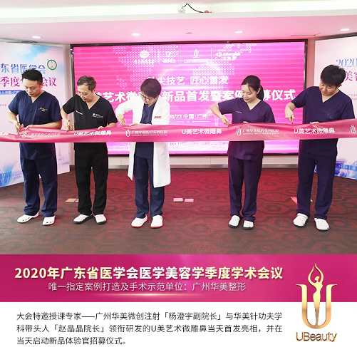 广州华美凭借高水平的学术地位及精湛的整形技术,成为本次大会【唯一指定案例打造及手术示范单位】,广州华美杨澄宇副院长受邀出席学术大会担任授课专家,与业内顶尖学术力量齐聚一堂,共研医美技术新高度。而作为2020年广东省医学会医学美容学季度学术会议特邀授课专家——广州华美微创注射杨澄宇副院长与华美针功夫学科带头人赵晶晶院长领衔研发的U美艺术微雕鼻在当天首发亮相!